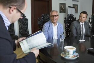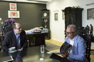 Spotkanie Prezydenta Gdańska Pawła Adamowicza z Prezydentem Zduńskiej Woli Piotrem Niedźwieckim. Gdańsk, Urząd Miejski
