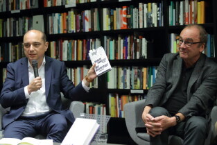 Gdańsk, Europejskie Centrum Solidarności. Spotkanie z Robertem Menasse, autorem powieści "Stolica". Nz. Basil Kerski-Dyrektor ECS i Robert Menasse.