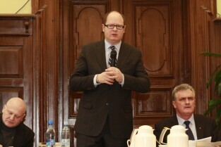 Nowy Ratusz. Spotkanie władz miasta z parlamentarzystami z gdańskiego okręgu wyborczego dotyczące nowych inicjatyw prawnych oraz spraw priorytetowych dla Gdańska. Przemawia Prezydent Gdańska Paweł Adamowicz.