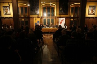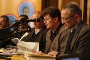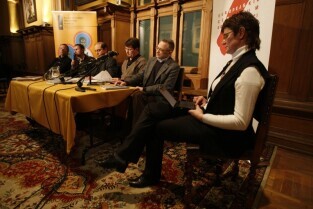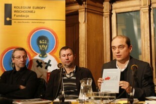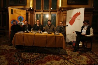 Spotkanie z bialoruskimi poetami i pisarzami zorganizowane przez Kolegium Europy Wschodniej i Europejskie Centrum Solidarności. Gdańsk, Nadbałtyckie Centrum Kultury - Ratusz Staromiejski. Nz. od lewej: Artur Klinau, Ihar Babkou, Basil Kerski (prowadzący spotkanie), Andrej Chadanowicz, Adam Pomorski (Prezes PEN CLUB w Warszawie), Ewa Wieżnawiec