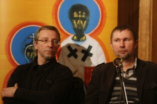 Spotkanie z bialoruskimi poetami i pisarzami zorganizowane przez Kolegium Europy Wschodniej i Europejskie Centrum Solidarności. Gdańsk, Nadbałtyckie Centrum Kultury - Ratusz Staromiejski. Nz. od lewej: Artur Klinau, Ihar Babkou