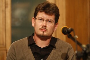 Spotkanie z bialoruskimi poetami i pisarzami zorganizowane przez Kolegium Europy Wschodniej i Europejskie Centrum Solidarności. Gdańsk, Nadbałtyckie Centrum Kultury - Ratusz Staromiejski. Nz. Andrej Chadanowicz