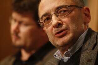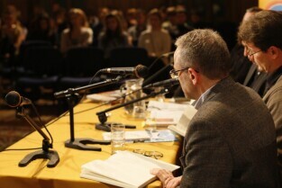 Spotkanie z bialoruskimi poetami i pisarzami zorganizowane przez Kolegium Europy Wschodniej i Europejskie Centrum Solidarności. Gdańsk, Nadbałtyckie Centrum Kultury - Ratusz Staromiejski. Nz. od prawej: Basil Kerski (prowadzący spotkanie), Ihar Babkou, Artur Klinau