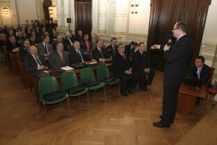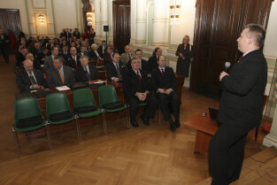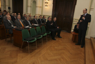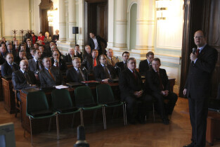 Spotkanie Prezydenta Gdańska Pawła Adamowicza z gdańskimi biznesmenami. Nz. przemawia Paweł Olechnowicz, Prezes Rafinerii Gdańskiej S.A.