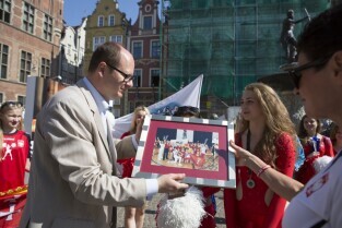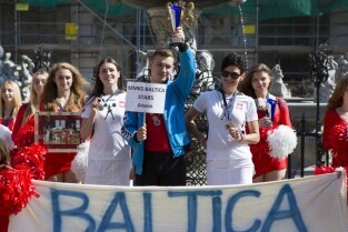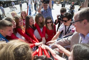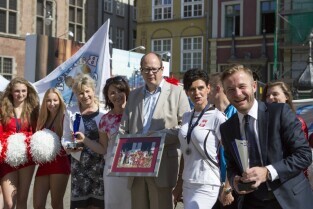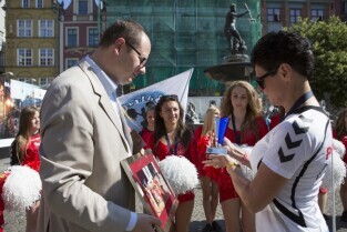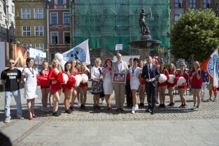 Spotkanie Prezydenta Gdańska Pawła Adamowicza z członkami zespołu Baltica Cheerleaders, który zajął III miejsce w 2014 European Cheerleading Championship. Gdańsk, Długi Targ