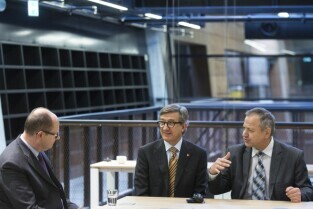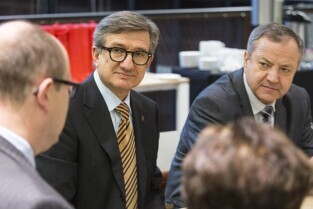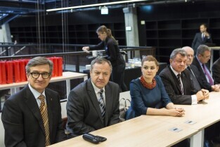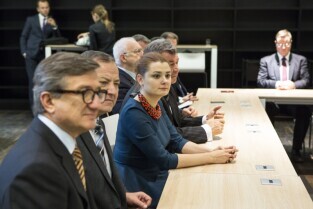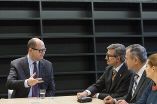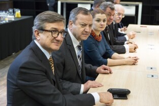 Spotkanie Prezydenta Gdańska Pawła Adamowicza z delegacją z ukraińskiego Mariupola, w składzie której znaleźli się m.in. Mer Mariupola Jurij Chotłubiej i Poseł do Rady Najwyższej Ukrainy Siergiej Taruta. Gdańsk, Europejskie Centrum Solidarności