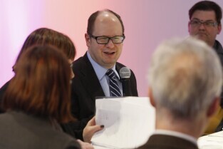 Spotkanie Prezydenta Gdańska Pawła Adamowicza z dyrektorami gdańskich instytucji kultury poświęcone planom na 2013 rok. Gdańsk Nowy Port, Łaźnia 2. Nz. Dyrektor Wojewódzkiej i Miejskiej Biblioteki Publicznej w Gdańsku Paweł Braun