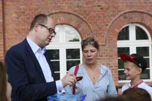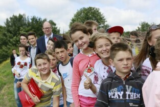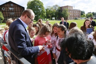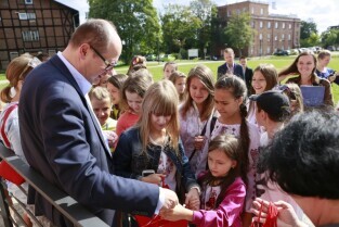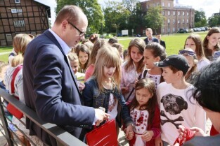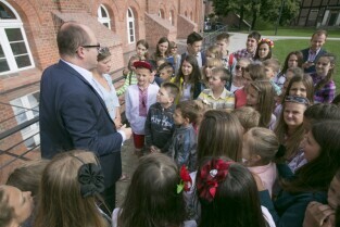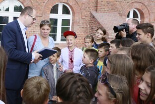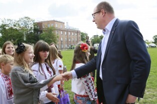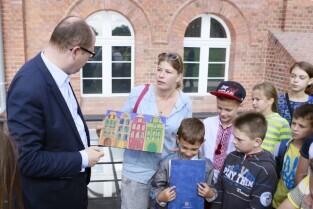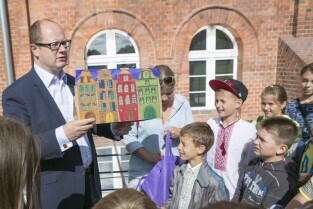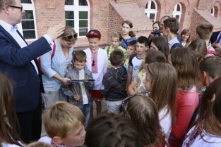 Gdańsk, Centrum Hewelianum. Spotkanie prezydenta Gdańska Pawła Adamowicza z grupą dzieci z Ukrainy i ich opiekunami wypoczywającymi w naszym mieście.