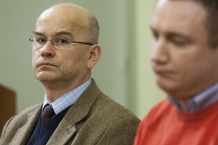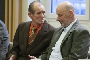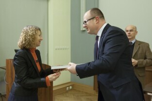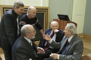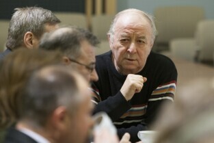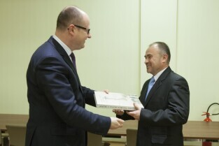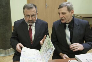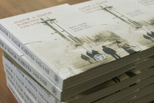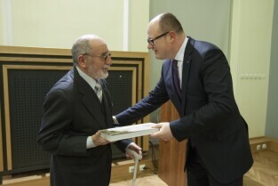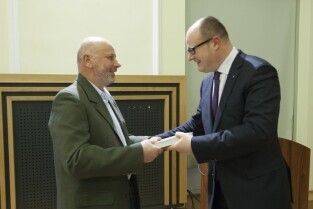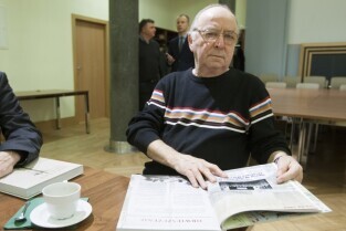 Urząd Miejski w Gdańsku. Spotkanie Prezydenta Gdańska Pawła Adamowicza z internowanymi w stanie wojennym, którym wręczył albumy fotograficzne "Gdańsk w stanie wojennym 1981 - 1983". Nz. Karol Lisiecki - jeden z redaktorów albumu