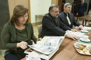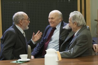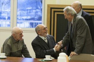 Urząd Miejski w Gdańsku. Spotkanie Prezydenta Gdańska Pawła Adamowicza (nz) z internowanymi w stanie wojennym, którym wręczył albumy fotograficzne "Gdańsk w stanie wojennym 1981 - 1983"