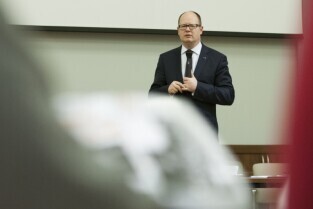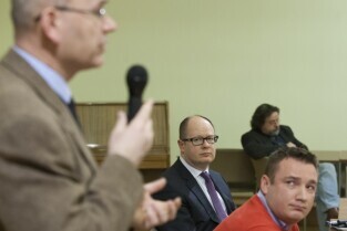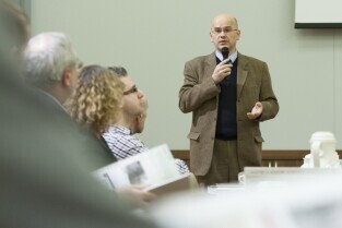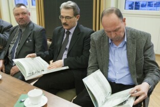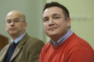 Urząd Miejski w Gdańsku. Spotkanie Prezydenta Gdańska Pawła Adamowicza z internowanymi w stanie wojennym, którym wręczył albumy fotograficzne "Gdańsk w stanie wojennym 1981 - 1983". Nz. Naczelnik Biura Edukacji Publicznej oddziału IPN w Gdańsku Grzegorz Berendt