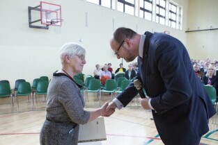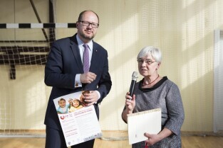 Gdańsk Niedźwiednik, ZKPiG nr 24. Spotkanie Prezydenta Gdańska Pawła Adamowicza z mieszkańcami dzielnicy Brętowo z cyklu „Twoja dzielnica - Twój Gdańsk". Nz. Prezydent Gdańska wręcza podziękowanie za działania na rzecz osób niepełnosprawnych, które otrzymuje Prezes Fundacji Sprawni Inaczej Justyna Rogińska