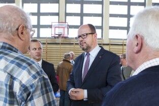 Gdańsk Niedźwiednik, ZKPiG nr 24. Spotkanie Prezydenta Gdańska Pawła Adamowicza z mieszkańcami dzielnicy Brętowo z cyklu „Twoja dzielnica - Twój Gdańsk". Dyskusja tematyczna z Z-cą Prezydenta ds. polityki społecznej Piotrem Kowalczukiem. Nz. Prezydent Gdańska Paweł Adamowicz