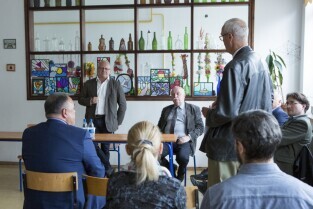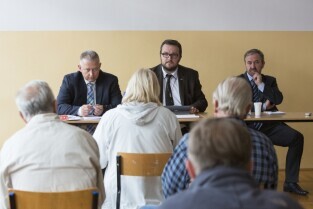 Gdańsk Niedźwiednik, ZKPiG nr 24. Spotkanie Prezydenta Gdańska Pawła Adamowicza z mieszkańcami dzielnicy Brętowo z cyklu „Twoja dzielnica - Twój Gdańsk". Dyskusja tematyczna z Z-cą Prezydenta ds. polityki gospodarczej Andrzejem Bojanowskim (po lewej), po środku Dyrektor Wydziału Programów Rozwojowych UMG Marcin Dawidowski