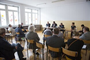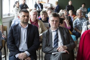Gdańsk Niedźwiednik, ZKPiG nr 24. Spotkanie Prezydenta Gdańska Pawła Adamowicza z mieszkańcami dzielnicy Brętowo z cyklu „Twoja dzielnica - Twój Gdańsk". Dyskusja tematyczna z Sekretarz Miasta Danutą Janczarek (w imieniu Z-cy Prezydenta ds. polityki komunalnej). Nz. po prawej Dyrektor Zarządu Transportu Miejskiego w Gdańsku Jerzy Dobaczewski i jego zastępca Sebastian Zomkowski (po lewej)
