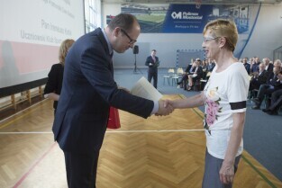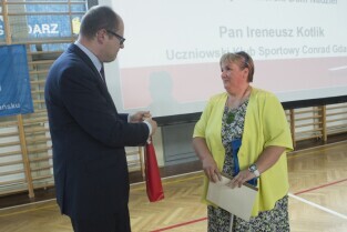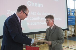 Spotkanie Prezydenta Gdańska Pawła Adamowicza z mieszkańcami gdańskiej dzielnicy Chełm z cyklu "Mój dom, moja dzielnica, moje miasto". Gdańsk Chełm, ZSO nr 7. Nz. Prezydent Gdańska wyróżnia osoby aktywnie działające na terenie dzielnicy