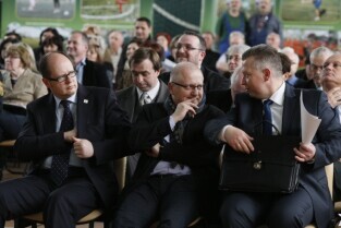 Spotkanie Prezydenta Gdańska Pawła Adamowicza z cyklu "Mój dom, moja dzielnica, moje miasto" z mieszkańcami osiedla Jasień w Gdańsku. SP nr 85 przy ul. Stolema. Nz. od lewej: Prezydent Gdańska Paweł Adamowicz i jego zastępcy Wiesław Bielawski oraz Andrzej Bojanowski