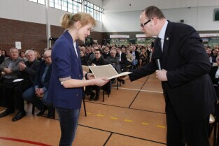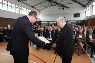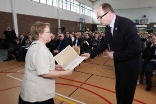Spotkanie Prezydenta Gdańska Pawła Adamowicza z cyklu "Mój dom, moja dzielnica, moje miasto" z mieszkańcami osiedla Jasień w Gdańsku. SP nr 85 przy ul. Stolema. Nz. Prezydent Gdańska Paweł Adamowicz wręcza podziękowania aktywnym społecznie mieszkańcom osiedla