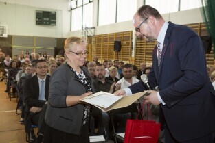 Gdańsk Jasień. Spotkanie Prezydenta Gdańska Pawła Adamowicza i władz miasta z mieszkańcami dzielnicy. Nz. . Nz. Prezes Stowarzyszenia Jasień Magdalena Nowicka otrzymuje wyróżnienie Prezydenta Gdańska