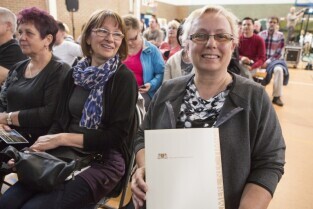 Gdańsk Jasień. Spotkanie Prezydenta Gdańska Pawła Adamowicza i władz miasta z mieszkańcami dzielnicy. Nz. . Nz. Prezes Stowarzyszenia Jasień Magdalena Nowicka, która otrzymała wyróżnienie Prezydenta Gdańska
