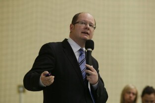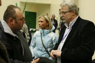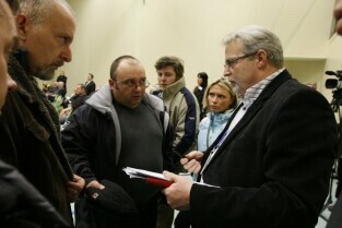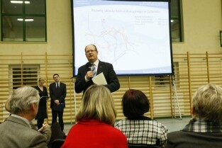 Gdańsk Złota Karczma. Spotkanie Prezydenta Gdańska Pawła Adamowicza z mieszkańcami Klukowa, Matarni, Złotej Karczmy. Nz. Prezes Portu Lotniczego Gdańsk Włodzimierz Machczyński objaśnia plany rozbudowy lotniska