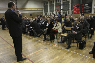 Spotkanie obywatelskie Prezydenta Gdańska Pawła Adamowicza z mieszkańcami dzielnicy Nowy Port. Gdańsk, ZSO nr 5. Nz. z mikrofonem Paweł Adamowicz