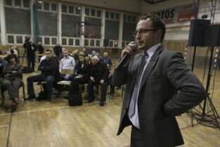 Spotkanie obywatelskie Prezydenta Gdańska Pawła Adamowicza z mieszkańcami dzielnicy Nowy Port. Gdańsk, ZSO nr 5. Nz. z mikrofonem Radny Miasta Gdańska Marcin Skwierawski