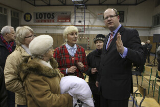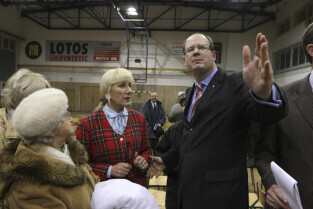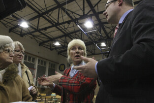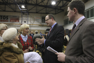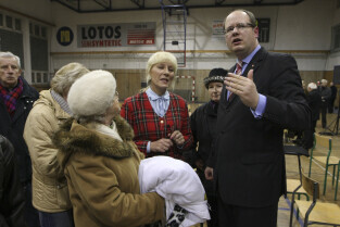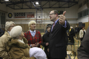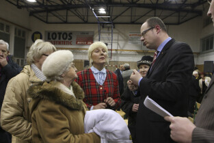Spotkanie obywatelskie Prezydenta Gdańska Pawła Adamowicza z mieszkańcami dzielnicy Nowy Port. Gdańsk, ZSO nr 5. Nz. Paweł Adamowicz wśród mieszkańców
