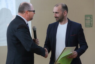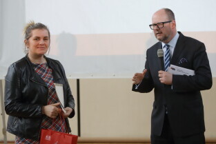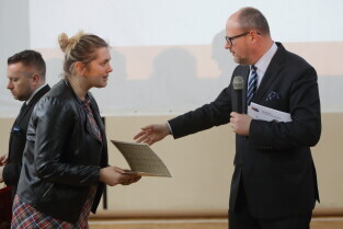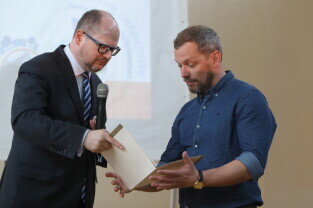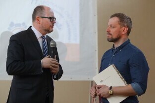 Gdańsk. Spotkanie Prezydenta Pawła Adamowicza z mieszkańcami Orunia – Św. Wojciech – Lipce. Nz. Wręczenie Wyróżnienia Prezydenta Gdańska dla Przemysława Kluzy.