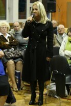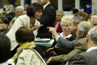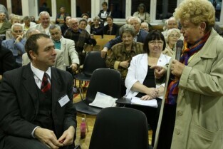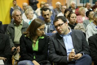 Spotkanie obywatelskie Prezydenta Gdańska Pawła Adamowicza z mieszkańcami Przymorza Wielkiego. Gdańsk, Zespół Szkół Zawodowych nr 9. Nz. gdańscy radni, od lewej: Agnieszka Owczarczak, Piotr Skiba
