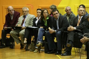 Spotkanie obywatelskie Prezydenta Gdańska Pawła Adamowicza z mieszkańcami Przymorza Wielkiego. Gdańsk, Zespół Szkół Zawodowych nr 9. Nz. gdańscy radni, od lewej: Agnieszka Owczarczak, Piotr Skiba, Jerzy Borowczak