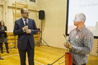 Spotkanie Prezydenta Gdańska Pawła Adamowicza z mieszkańcami dzielnicy Przymorze Wielkie z cyklu "Twoja dzielnica - Twój Gdańsk". Gdańsk Przymorze, Ogólnokształcące Szkoły Sportowe. Nz. Prezydent wręcza wyróżnienie dla Krzysztofa Skrzypskiego z Polskiego Stowarzyszenia na Rzecz Osób z Upośledzeniem Umysłowym
