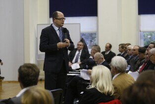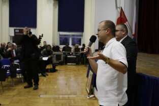 Spotkanie Prezydenta Gdańska Pawła Adamowicza z mieszkańcami Śródmieścia z cyklu "Mój dom, moja dzielnica, moje miasto". Gdańsk, Technikum Łączności przy Podwalu Staromiejskim. Nz. Z-ca Prezydenta Gdańska Maciej Lisicki