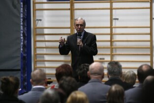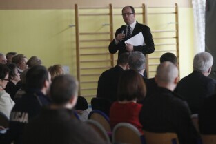 Spotkanie Prezydenta Gdańska Pawła Adamowicza z cyklu "Mój dom, moja dzielnica, moje miasto" z mieszkańcami Ujeściska i Łostowic. Gdańsk Ujeścisko, SP 12 przy ul. Człuchowskiej. Nz. Z-ca Dyrektora Wydziału Edukacji UMG Jerzy Jasiński
