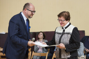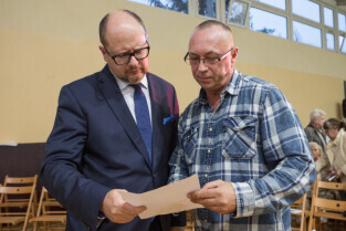 Spotkanie władz miasta z mieszkańcami dzielnicy Wrzeszcz Górny z cyklu "Twoja dzielnica - Twój Gdańsk". Szkoła Podstawowa nr 39 przy ul. Obywatelskiej. Nz. Prezydent Gdańska Paweł Adamowicz wręcza nagrodę za postawę obywatelską, którą otrzymuje Prezes Europejskiej Fundacji Ochrony Zabytków Aleksandra Kociałkowska