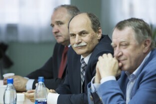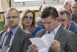 Spotkanie Prezydenta Gdańska Pawła Adamowicza z mieszkańcami dzielnicy Zaspa-Rozstaje z cyklu „Twoja dzielnica - Twój Gdańsk". ZKPiG nr 12 przy ul. Burzyńskiego. Nz. od lewej: Z-ca Prezydenta Gdańska Wiesław Bielawski, Z-ca Prezydenta Gdańska Piotr Kowalczuk i Sekretarz Miasta Gdańska Danuta Janczarek