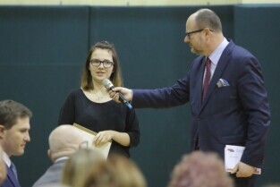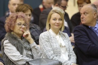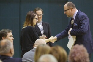 Gdańsk, Zespół Szkół Energetycznych. Spotkanie Prezydenta Pawła Adamowicza i Urzędników z mieszkańcami dzielnicy Młyniska. Nz. Anna Szmurło która odebrała Wyróżnienie Prezydenta Miasta Gdańska dla Iwony Zając i Prezydent Gdańska Paweł Adamowicz.