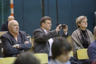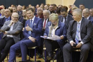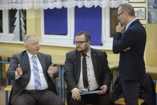 Gdańsk, Zespół Szkół Energetycznych. Spotkanie Prezydenta Pawła Adamowicza i Urzędników z mieszkańcami dzielnicy Młyniska. Nz. Wiceprezydent Gdańska Wiesław Bielawski, Wiceprezydent Gdańska Piotr Grzelak, Danuta Janczarek-Sekretarz Miasta i Wiceprezydent Gdańska Andrzej Bojanowski.