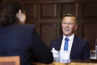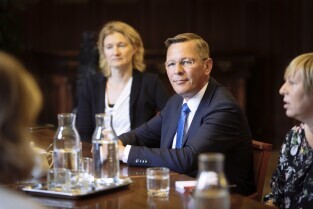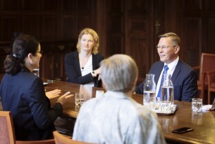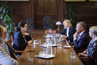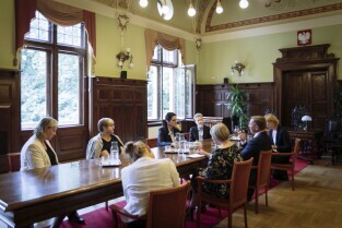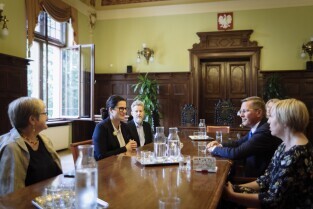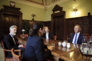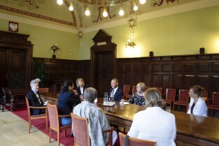 Gdańsk, Biuro Rady Miasta Gdańska. Spotkanie Prezydent Gdanska Aleksandry Dulkiewicz z prezydentem Parlamentu Bremeńskiego – panem Frankiem Imhoffem. Skład delegacji: Frank Imhoff – Prezydent Parlamentu Bremeńskiego, Dorothee Krumpipe – Rzecznik Prasowy, Rebekka Gruppe – Asystentka i Dyrektor Biura Rady, Anja Leibing – Protokół i Sprawy Międzynarodowe