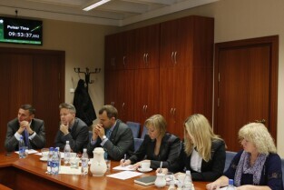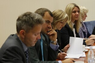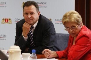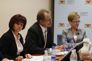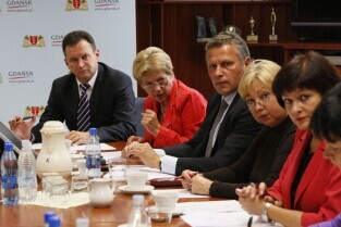 Gdańsk, Urząd Miejski. Robocze spotkanie delegacji wileńskiej z przedstawicielami władz Gdańska, poświęcone współpracy obu miast. Nz. od lewej: Wicemer Wilna Jaroslav Kaminski, Sekretarz Miasta Gdańska Danuta Janczarek, Dyrektor Administracyjny Wilna Valdas Klimantavicius