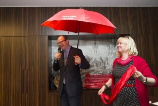 Spotkanie Prezydenta Gdańska Pawła Adamowicza z gdańskimi przewodnikami turystycznymi. Gdańsk, Hotel Mercure-Hevelius. Nz. Prezydent prezentuje parasole, które w prezencie otrzymają przewodnicy. Po prawej Dyrektor Biura Prezydenta ds. Promocji Miasta Anna Zbierska