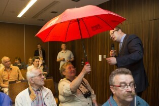 Spotkanie Prezydenta Gdańska Pawła Adamowicza z gdańskimi przewodnikami turystycznymi. Gdańsk, Hotel Mercure-Hevelius. Nz. Prezydent prezentuje parasole, które w prezencie otrzymają przewodnicy