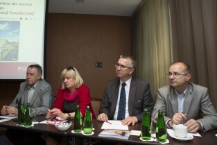 Spotkanie Prezydenta Gdańska Pawła Adamowicza z gdańskimi przewodnikami turystycznymi. Gdańsk, Hotel Mercure-Hevelius. Nz. od prawej: Z-ca Prezydenta Gdańska Maciej Lisicki, Komendant Straży Miesjkiej w Gdańsku Leszek Walczak, Dyrektor Biura Prezydenta ds. Promocji Miasta Anna Zbierska, Dyrektor Zarządu Dróg i Zieleni w Gdańsku Mieczysław Kotłowski