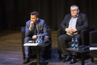 Gdańsk, Europejskie Centrum Solidarności. Spotkanie konsultacyjne z seniorami "Razem inwestujemy w Gdańsk. Propozycja inwestycji do 2020 r.". Nz. Marcin Nowicki - Instytut Badań nad Gospodarką Rynkową i Z-ca Prezydenta Gdańska Piotr Kowalczuk