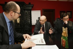 Spotkanie Prezydenta Gdańska Pawła Adamowicza z Prezesem Oddziału Zrzeszenia Kaszubsko-Pomorskiego w Gdańsku Pawłem Trawickim (po lewej) oraz jego poprzednikiem Tomaszem Szymańskiem (po prawej)