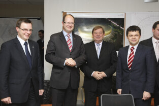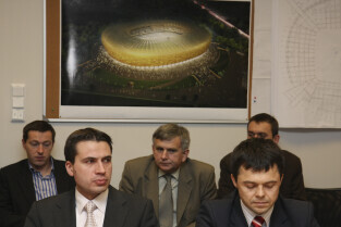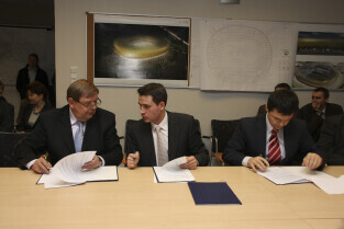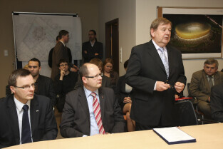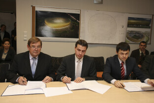 Podpisanie umowy pomiędzy spółką B.I.E.G. i firmą Wakoz na prace ziemne i melioracyjne na terenie stadionu na Letnicy. Nz. od lewej: Marcin Szpak (z-ca prezydenta), Paweł Adamowicz (Prezydent Gdańska), Ryszard Trykosko (B.I.E.G.2012), Jacek Wicki (Prezes WAKOZ)