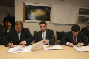 Podpisanie umowy pomiędzy spółką B.I.E.G. i firmą Wakoz na prace ziemne i melioracyjne na terenie stadionu na Letnicy. Nz. od lewej: Ryszard Trykosko (B.I.E.G.2012), Adam Kalata (B.I.E.G.2012) i Jacek Wicki (Prezes WAKOZ)