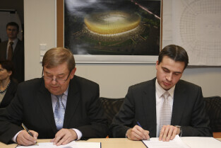 Podpisanie umowy pomiędzy spółką B.I.E.G. i firmą Wakoz na prace ziemne i melioracyjne na terenie stadionu na Letnicy. Nz. od lewej: Paweł Adamowicz (Prezydent Gdańska) i Jacek Wicki (Prezes WAKOZ)