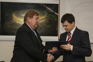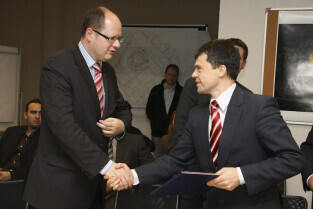 Podpisanie umowy pomiędzy spółką B.I.E.G. i firmą Wakoz na prace ziemne i melioracyjne na terenie stadionu na Letnicy. Nz. od lewej: Adam Kalata (B.I.E.G.2012) i Jacek Wicki (Prezes WAKOZ)