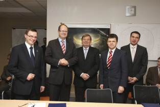 Podpisanie umowy pomiędzy spółką B.I.E.G. i firmą Wakoz na prace ziemne i melioracyjne na terenie stadionu na Letnicy. Nz. od lewej: Marcin Szpak (z-ca prezydenta), Paweł Adamowicz (Prezydent Gdańska), Ryszard Trykosko (B.I.E.G.2012), Jacek Wicki (Prezes WAKOZ), Adam Kalata (B.I.E.G.2012)